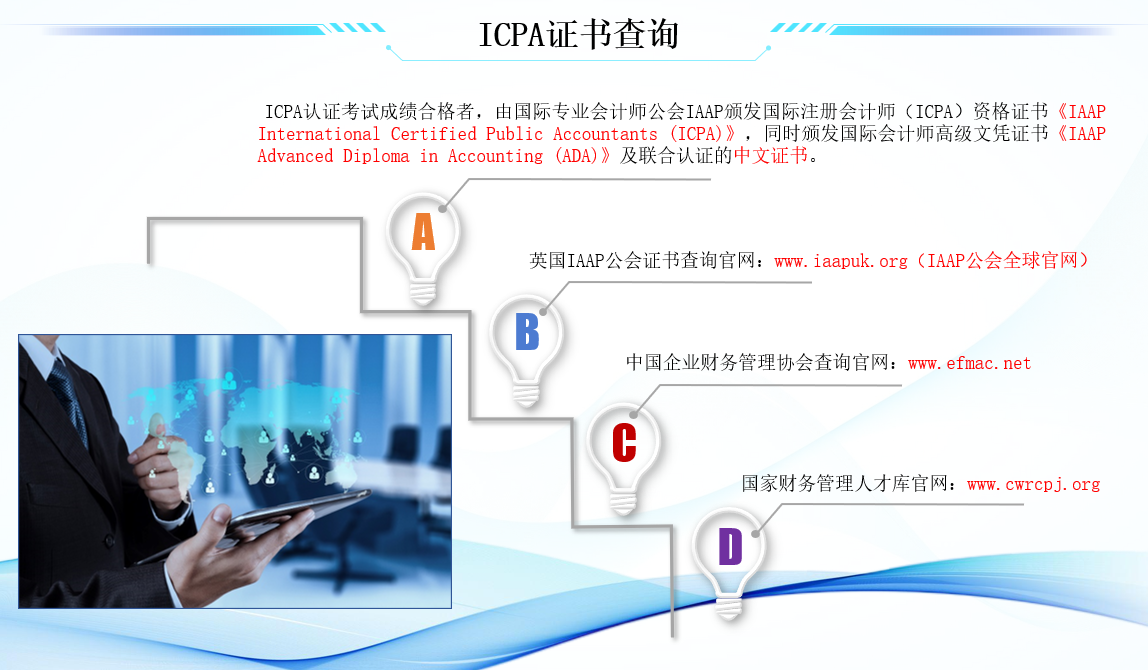 根据英国国际专业会计师公会IAAP全球认证课程体系,中国学员通过IAAP相应认证课程考试后,在获得国际专业会计师公会IAAP颁发的全球统一英文证书的同时,还将获得由英国国际专业会计师公会和中国企业财务管理协会联合颁发的国际注册会计师联合认证的相应级别中文证书,并将进入全国企业财务管理人才库,作为中高级财务管理人才管理和服务。