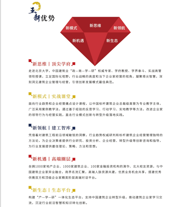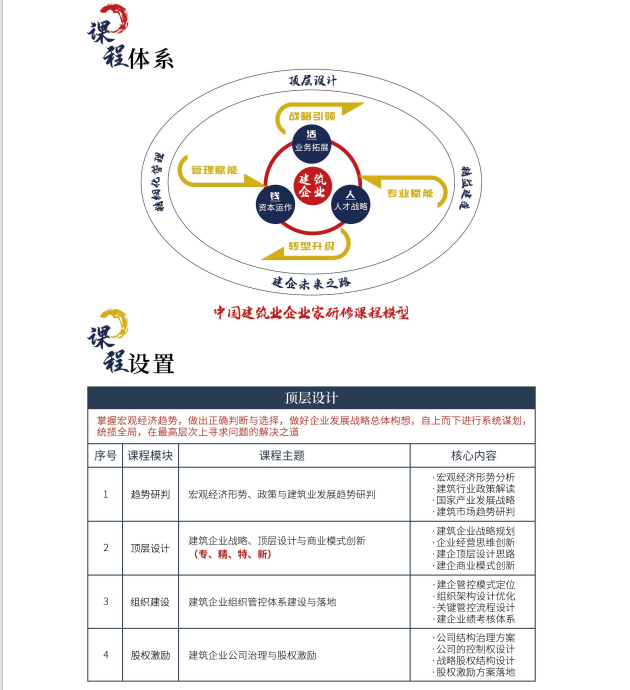中国建筑业EMBA高级研修班项目汇聚建筑业“政、商、学、研”顶级专家,聚焦行业共同面临的“活难揽、钱难融、人难管、账难要”四大难题,围绕建筑行业全产业链创新升级,培养具备国际视野、产业格局、战略思维、经营意识和资本运作能力的新时代建筑企业领袖。推动建筑业转型升级和高质量发展。