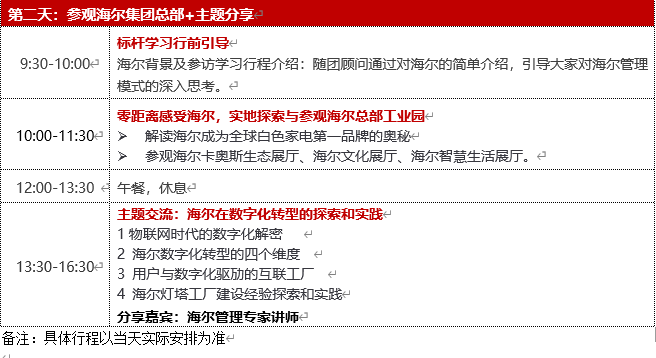 海信空调公司在质量管控、工厂建设、计划调度、仓储物流等各个环节,分别实现智能在线检测、数据治理与流通、车间智能排产、精准配送等智能化场景获得国家工信部认可。行程安排